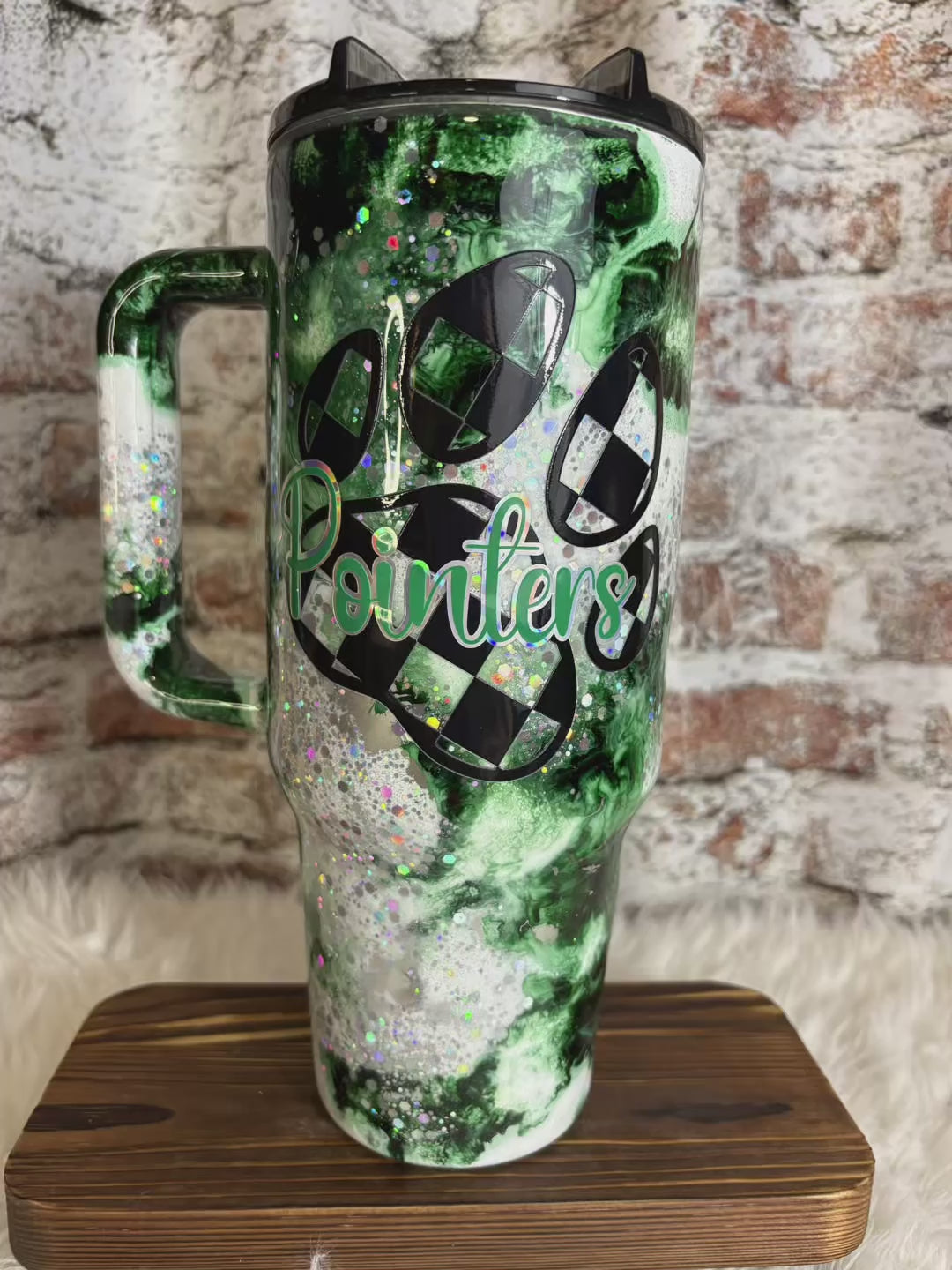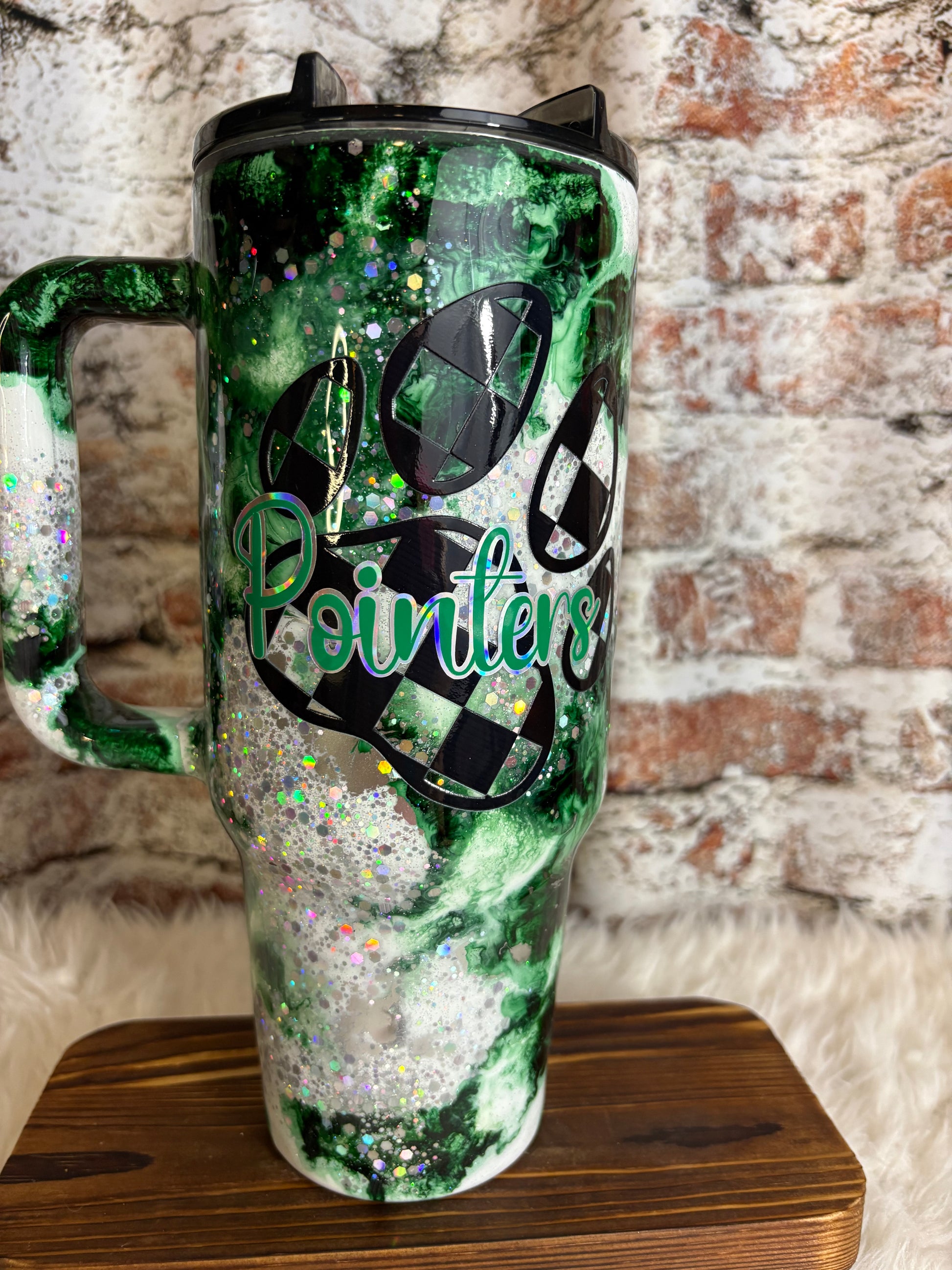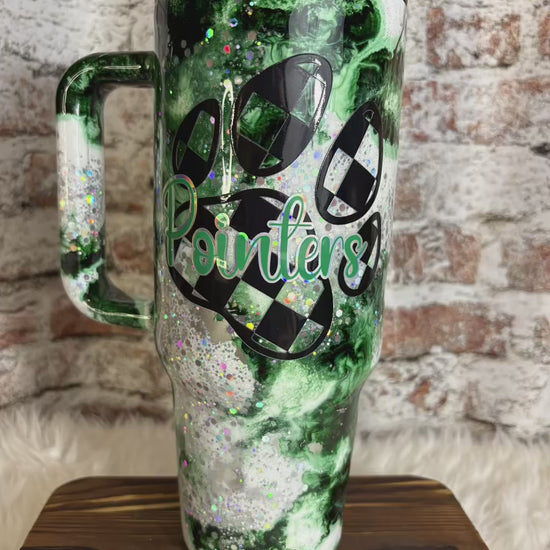 Show up and show out for your team with this bold 40 oz glitter tumbler! Designed with a deep green swirl, dazzling holographic sparkles, and a fierce black and white checkered paw print, it proudly reps the Pointers with standout style. Whether you’re tailgating, cheering in the stands, or just repping your roots – this tumbler’s got your back.
