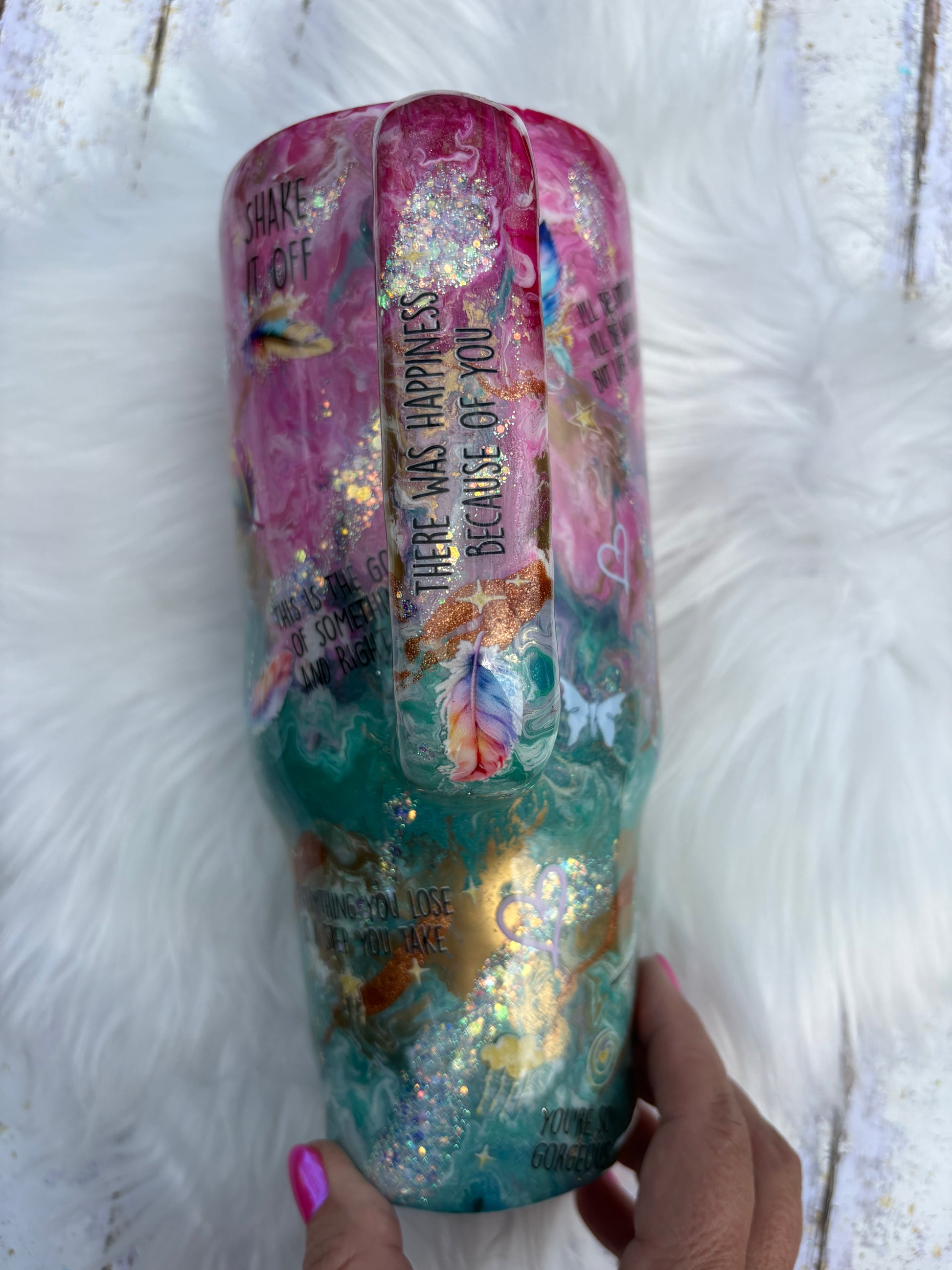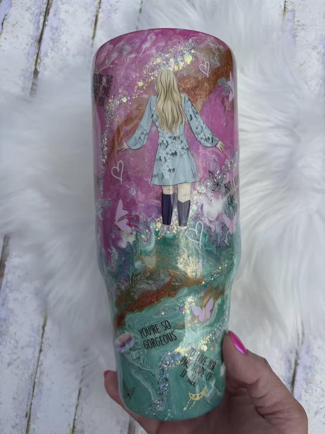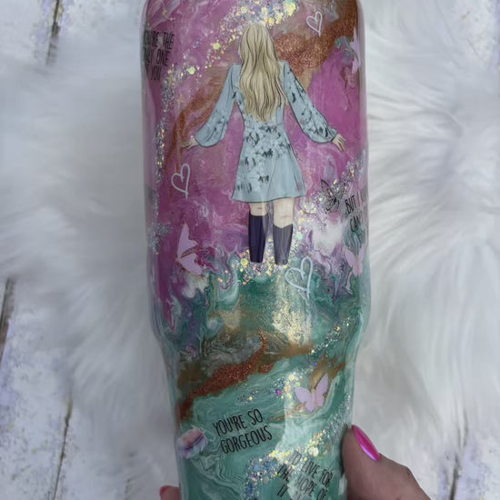 From the soft pinks to the deep teal, the shimmer, the lyrics, and every little detail in between—this 40 oz tumbler was made to stand out.